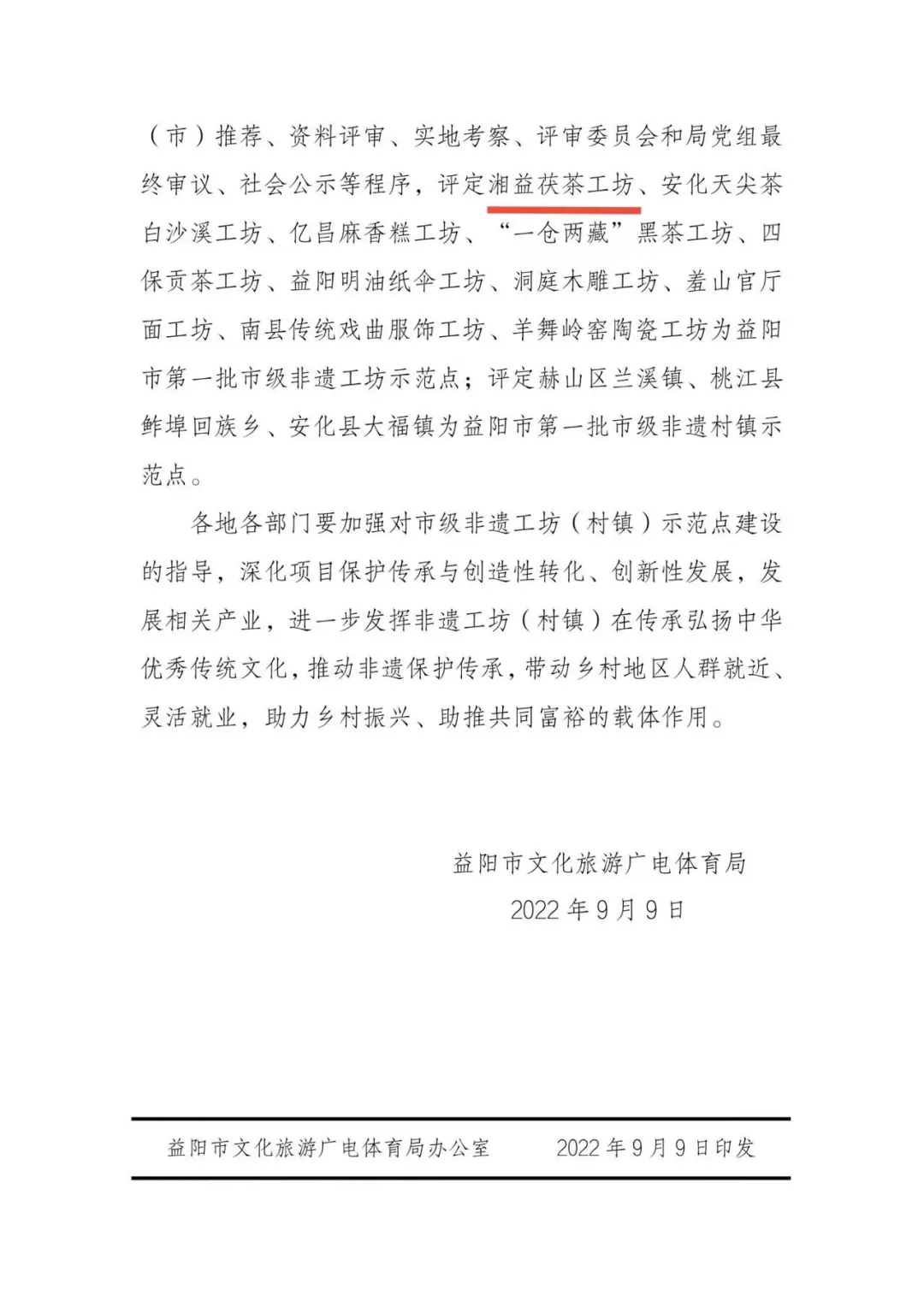 為深入貫徹中共中央辦公廳、國務院辦公廳《關(guān)于進一步加強非物質(zhì)文化遺產(chǎn)保護工作的意見》有關(guān)精神,市文化旅游廣電體育局在全市開展非遺工坊、非遺村鎮(zhèn)、非遺街區(qū)示范點建設(shè)工作,經(jīng)區(qū)縣(市)推薦、資料評審、實地考察、評審委員會和局黨組最終審議、社會公示等程序,評定湘益茯茶工坊、安化天尖茶白沙溪工坊、億昌麻香糕工坊、“一倉兩藏”黑茶工坊、四保貢茶工坊、益陽明油紙傘工坊、洞庭木雕工坊、羞山官廳面工坊、南縣傳統(tǒng)戲曲服飾工坊、羊舞嶺窯陶瓷工坊為益陽市第一批市級非遺工坊示范點;評定赫山區(qū)蘭溪鎮(zhèn)、桃江縣鲊埠回族鄉(xiāng)、安化縣大福鎮(zhèn)為益陽市第一批市級非遺村鎮(zhèn)示范點。