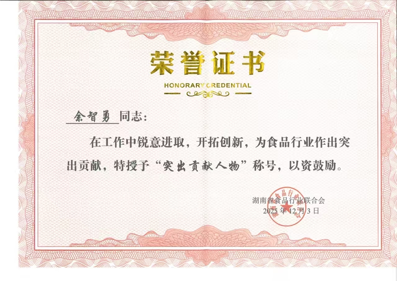 公司總經(jīng)理余智勇因在茯磚茶技藝傳承與創(chuàng)新、產(chǎn)品研發(fā)與品牌建設(shè),以及推動食品產(chǎn)業(yè)高質(zhì)量發(fā)展等方面作出的重要貢獻,被授予“突出貢獻人物”榮譽稱號。