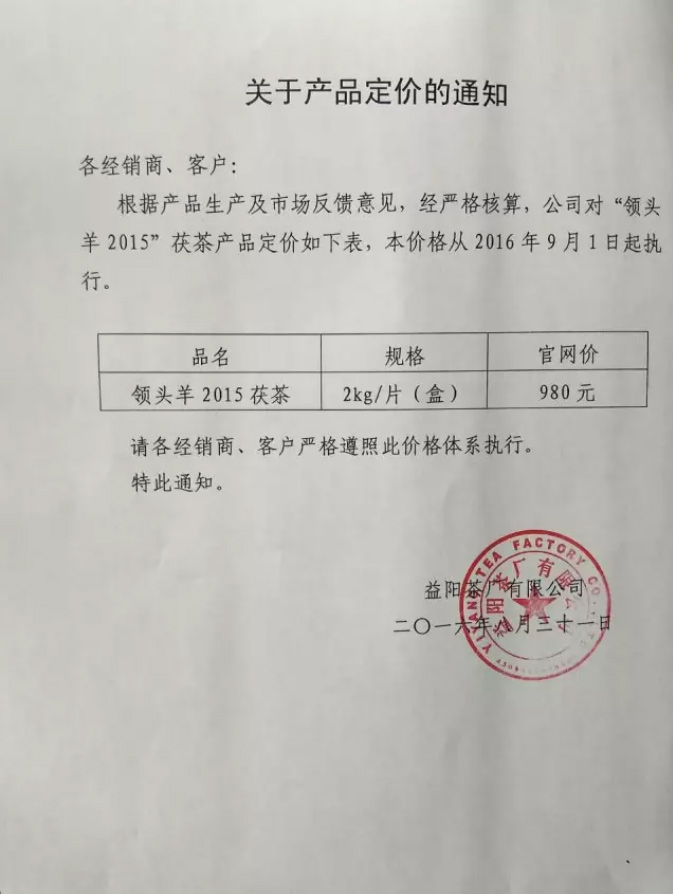根據(jù)產(chǎn)品生產(chǎn)及市場反饋意見,經(jīng)嚴格核算,公司對“領(lǐng)頭羊2015”茯茶產(chǎn)品定價如下表,本價格從2016年9月1日起執(zhí)行。