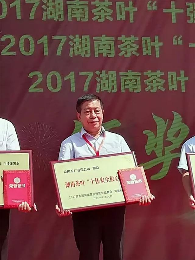 開幕式上,湖南省人民政府政協(xié)副主席戴道晉宣布第九屆湖南“茶博會(huì)”開幕。省領(lǐng)導(dǎo)為榮獲“2017湖南茶葉‘十佳安全放心品牌’‘十強(qiáng)生態(tài)產(chǎn)茶縣’‘十佳茶旅景區(qū)’”單位授牌頒獎(jiǎng)。湘益茯茶榮獲湖南茶葉“十佳安全放心品牌”榮譽(yù)稱號(hào),公司副總經(jīng)理、國家非遺茯磚茶技藝代表性傳承人劉杏益先生上臺(tái)領(lǐng)獎(jiǎng)。