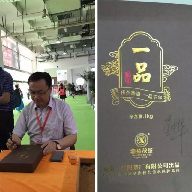 湖南農(nóng)業(yè)大學(xué)博士生導(dǎo)師劉仲華教授蒞臨展位,與湘益茯茶湖南省代理商熊志偉先生共同品鑒公司新品“1kg一品茯茶”,劉仲華教授對(duì)“1kg一品茯茶”贊賞有加并親筆簽名。